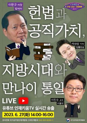 [법률방송뉴스]내일(28일)부터 시행하는 '만 나이 통일법' 관련 공직자의 이해를 돕는 실시간 공개강좌가 열립니다.국가공무원인재개발원(신영숙 원장)은 오늘(27일) 오후 2시 '헌법가치로 법치행정 구현하고, 행정법제 혁신으로 국민 삶을 편리하게' 주제로 '온통 실시간(Live) 국정과제' 유튜브 공개강좌를 진행합니다.이번 강좌는 유튜브 방송 '인재키움TV'를 통해 실시간 문답이 가능한 대화형으로 진행합니다.공무원뿐 아니라 관심 있는 국민은 누구나 시청할 수 있습니다.강좌에는